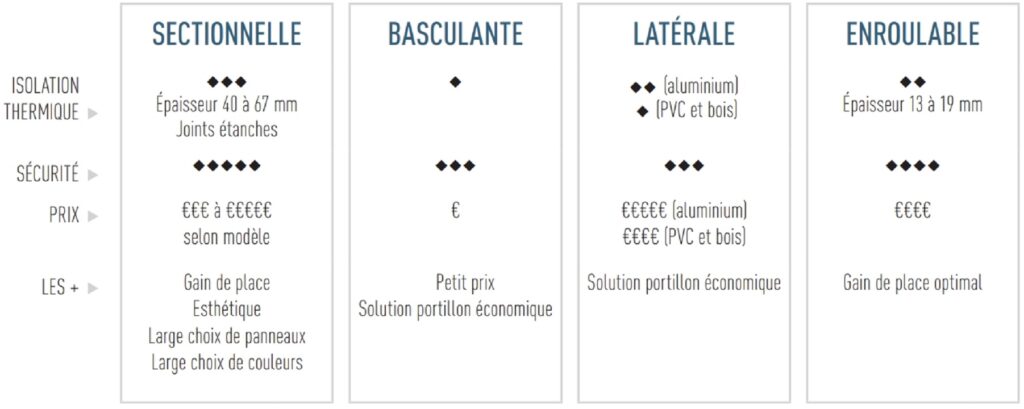 Différents types de portes de garage existent en fonction de la place dont vous disposez, de ce que vous souhaitez et bien sur de votre budget :